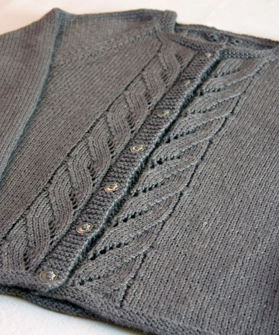 A pretty cardi, with a wide round neck, front button closure, three-quarter length sleeves and pretty lace panels at center front and back. Although the panels look intricate, they are simple to work. Best of all, the Cordova is totally seamless. Fronts, back, and button band are worked together to the underarms. Sleeves are worked in the round, then joined to the body for the yoke. The sides are shaped for a flattering fit. A versatile cardigan that’s easy to make and easy to wear.