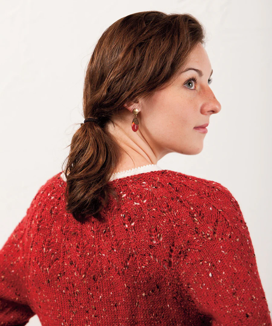 Go gracefully from denim to tweed with this versatile pattern. Helliwell is a sweet old-fashioned cardigan worked from the bottom up with a built-in button band and round yoke. The openwork motif around the yoke prettily frames the necks and shoulders while side shaping flatters the figure. Everything is edged with simple seed stitch. Includes instructions for both short and long sleeves.