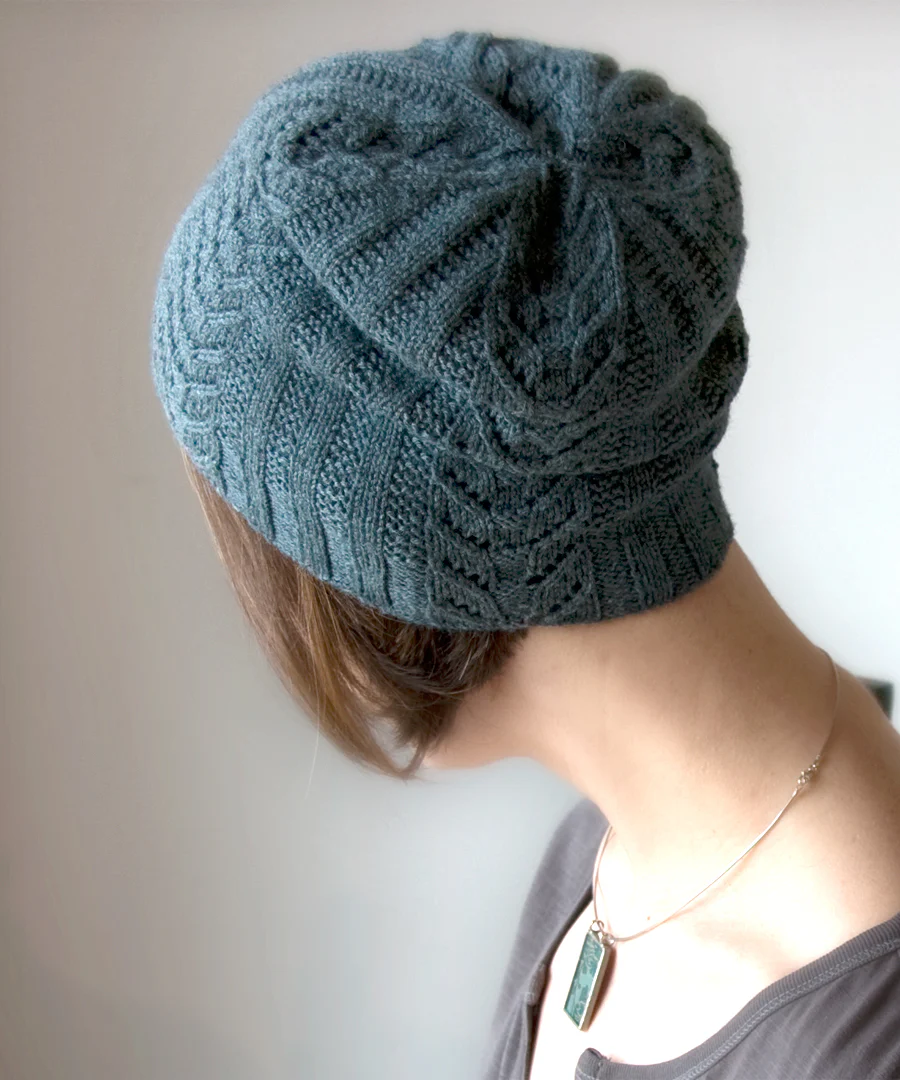 Paravel is a sweet little hat worked in fingering weight yarn. Panels of easy broken rib are separated by columns of Totem Pole lace, a traditional stitch pattern. The crown is shaped in graceful quadrants that meet in a tidy little quatrefoil. The pattern includes both a beanie and slouch version. The beanie is a trim little hat and sits nicely like an acorn’s cap. The slouchier version has deeper ribbing at the edge and sits at a more relaxed angle.